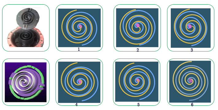 結構:動盤(渦旋轉子(zǐ))、靜(jìng)盤(渦旋定子(zǐ))、支架、十字聯軸環、背壓腔、偏心軸