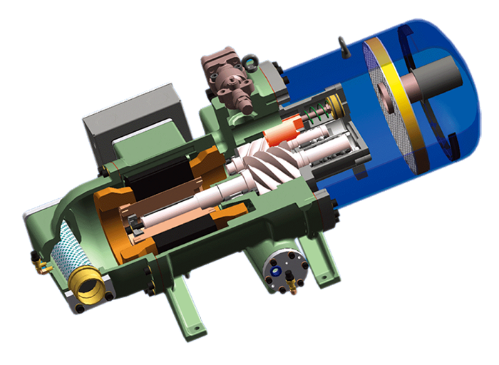 a、主機(jī)采用(yòng)半封閉螺杆壓縮機(jī)(标配中國(guó)台灣漢鐘(zhōng)複盛、德國(guó)比澤爾、意大(dà)利萊富康可(kě)選擇)、電(diàn)機(jī)、壓縮機(jī)一(yī)體(tǐ)化(huà),無軸封滲漏之慮;